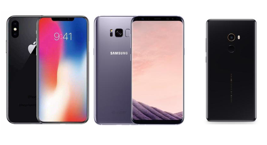 圖:iPhone X(左,2.5D玻璃+不鏽鋼);三星S8(中,3D玻璃+鋁合金);小米MIX2陶瓷版(右,Unibody全陶瓷)